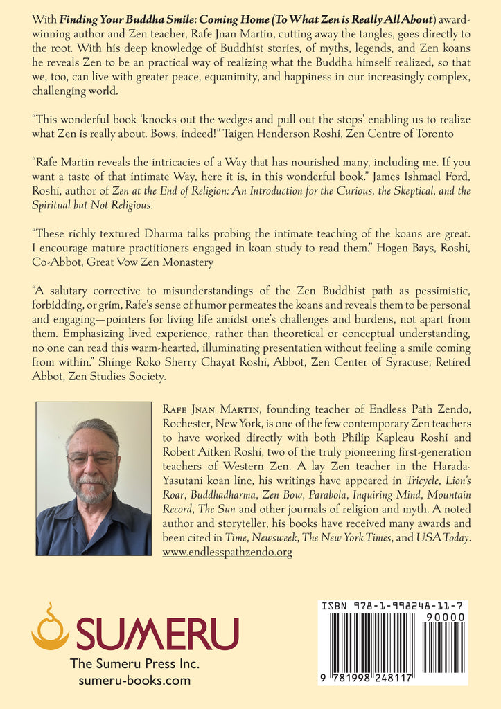 With Finding Your Buddha Smile: Coming Home (To What Zen is Really All About) lay Zen teacher and award-winning author, Rafe Jnan Martin, reveals Zen to be a thoroughly radical, yet completely accessible and practical way of realizing what the Buddha himself realized 2,500, years ago. As Roshi Martin makes clear, koan-based Zen is neither esoteric, nor reserved for the special few. Its whole point is to help us walk the Buddha Way and realize happiness and peace of mind while living full and satisfying lives in a complex and challenging world.